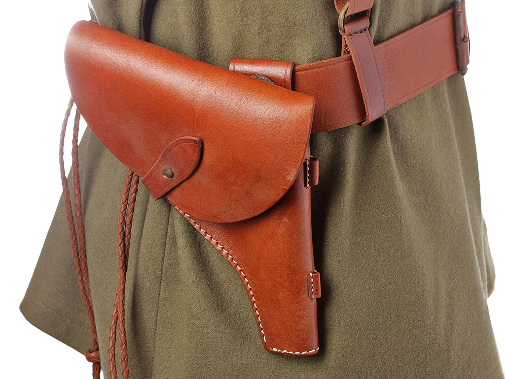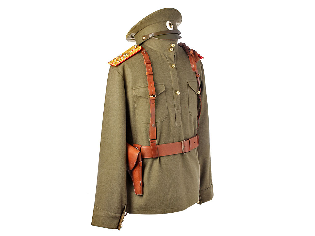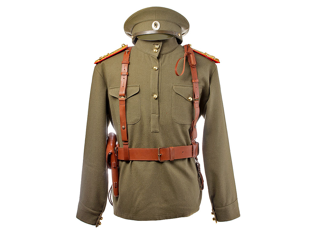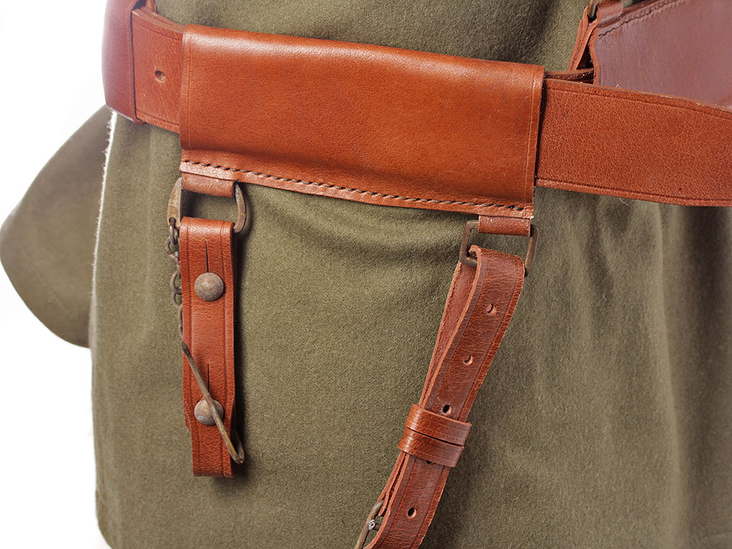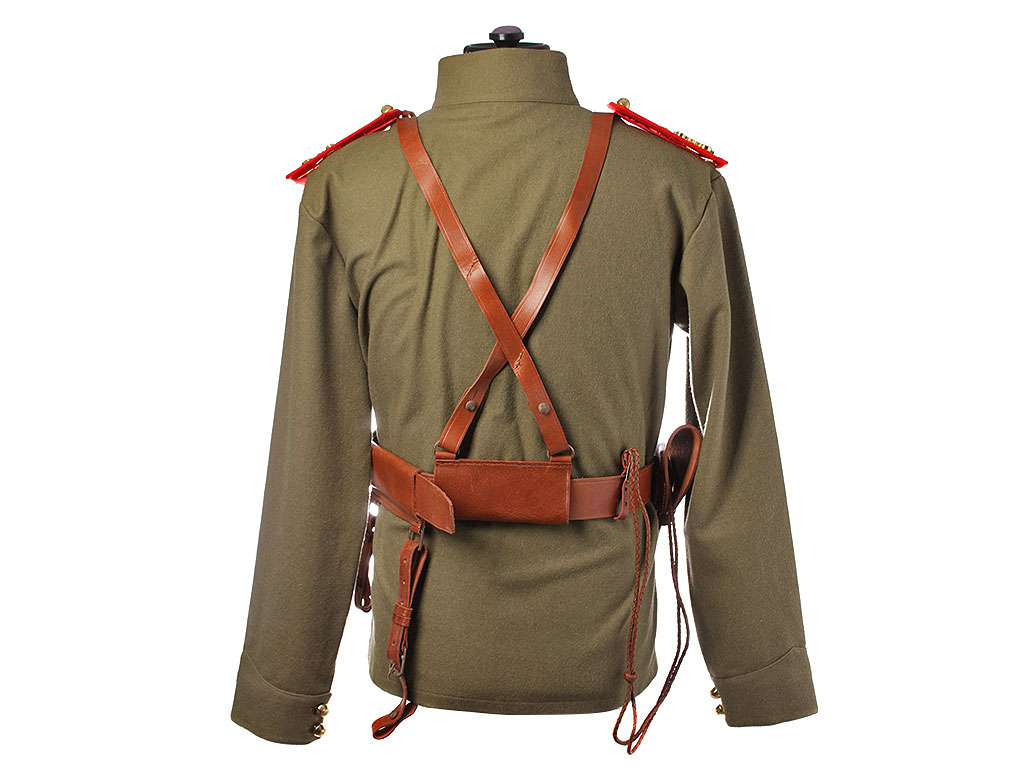 Комплект включает в себя весь необходимый набор полевого снаряжения. Ремень и портупея изготовлены из высококачественной мягкой кожи темно-рыжего цвета, имеется кобура для револьвера Наган со шнуром, на портупее - кожаный чехол для свистка, предназначенного для подачи команд в бою.