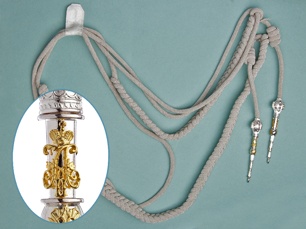 Плетеный из серебряного филигранного шнура аксельбант для контр-адмирала Свиты Е.И.В., генерал-майора Свиты Е.И.В. и флигель-адъютантов Свиты (капитан 1 ранга).