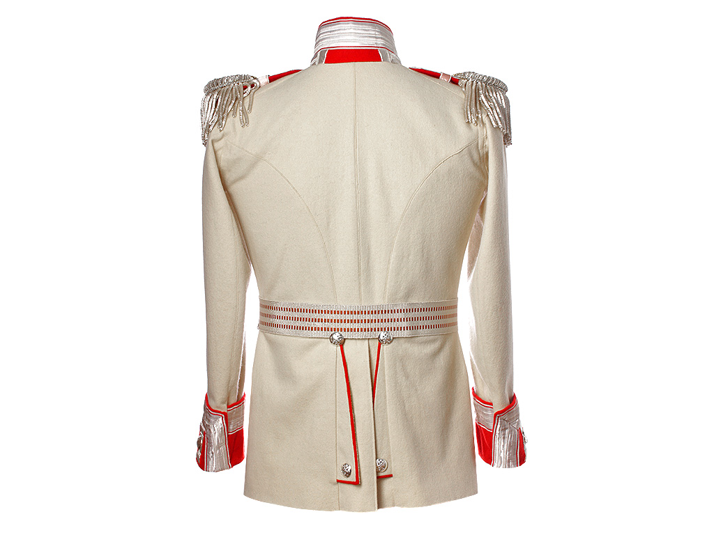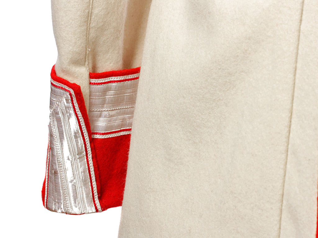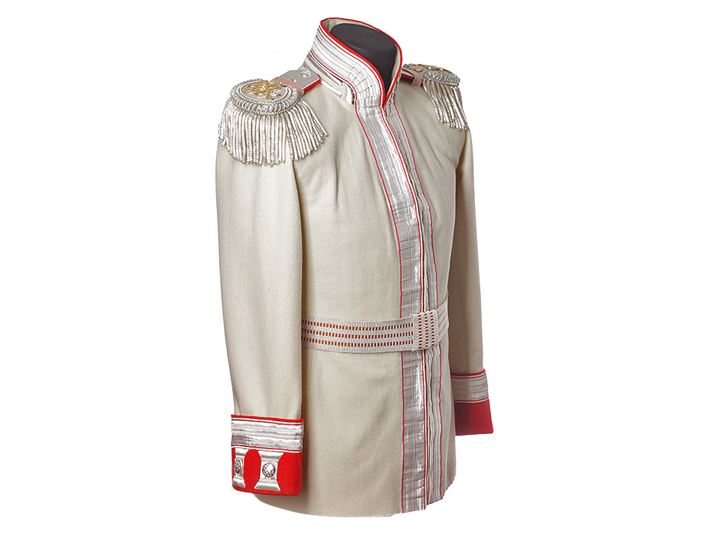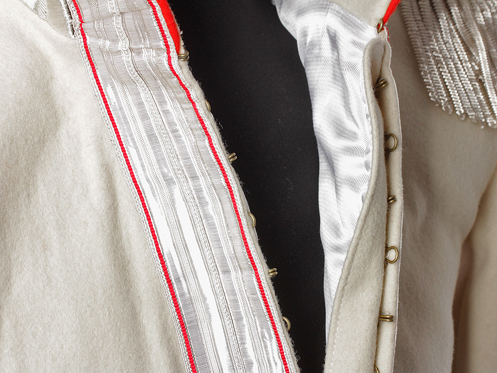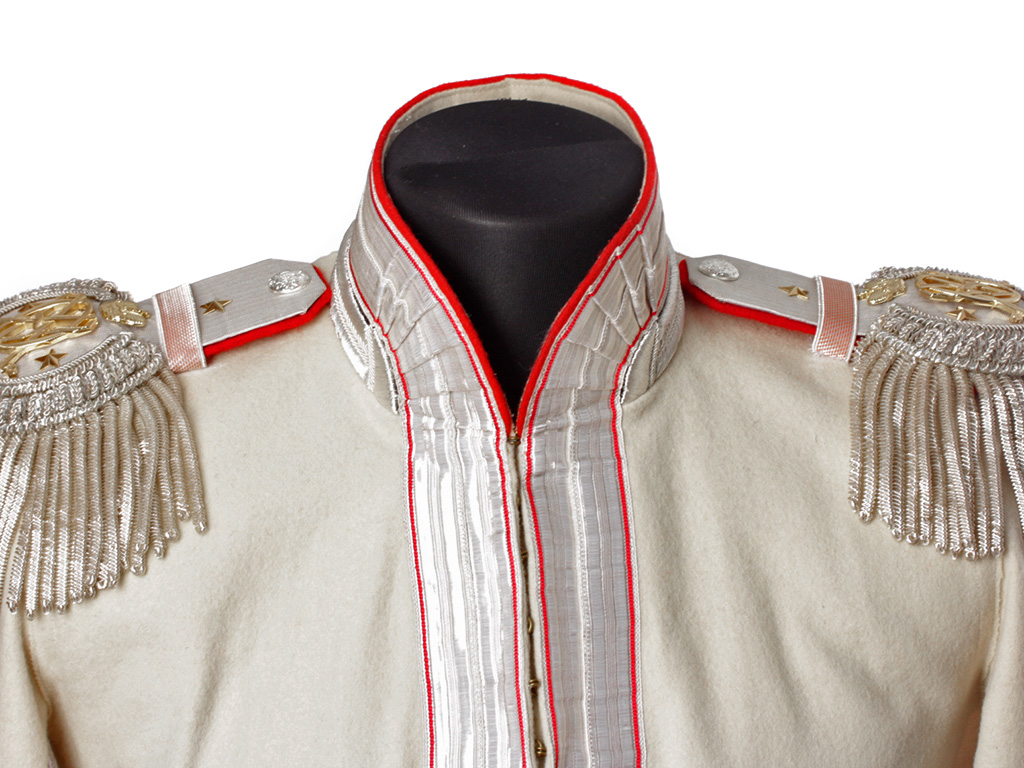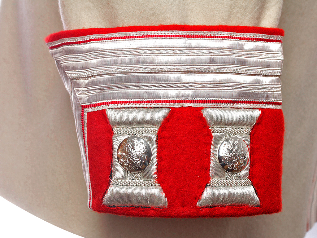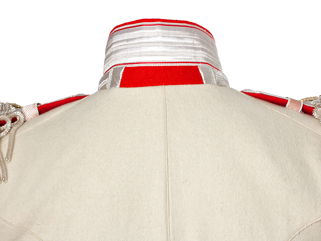 Из сукна белого цвета с алым кантом, высокий красный стоячий воротник с широким серебряным галуном, застегивающийся на один крючок. Обшлага красного цвета, по верхнему краю также обшиты серебряным галуном. Укомплектован поясом-шарфом и эполетами с серебряной бахромой, украшенными накладным золотым вензелем Императрицы Марии Федоровны (накладной вензель использовался только в 1-м эскадроне полка), со знаками различия подполковника.