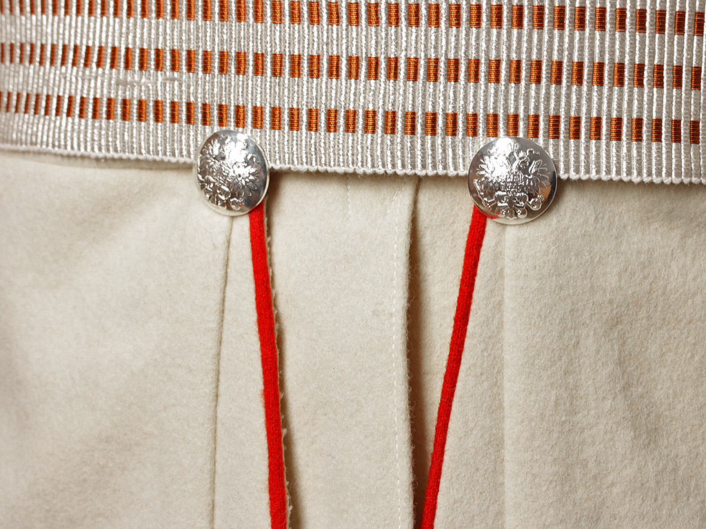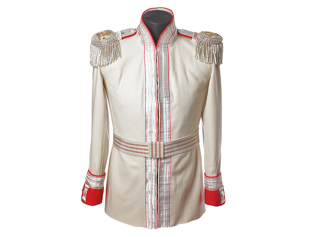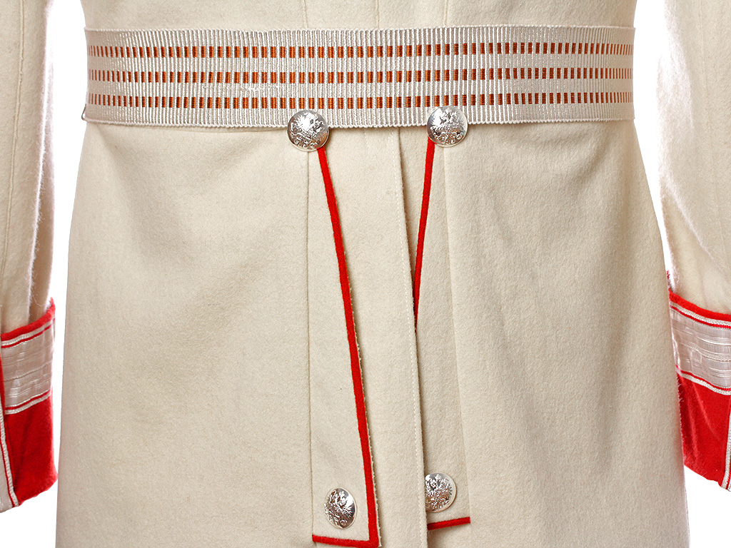Мундир однобортный, застегивающийся на крючки. Пуговицы на погонах и обшлагах с изображением Государственного герба (белый прибор).