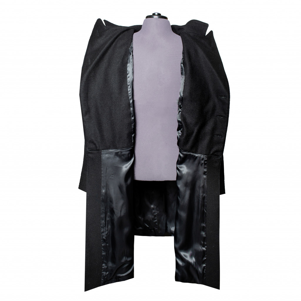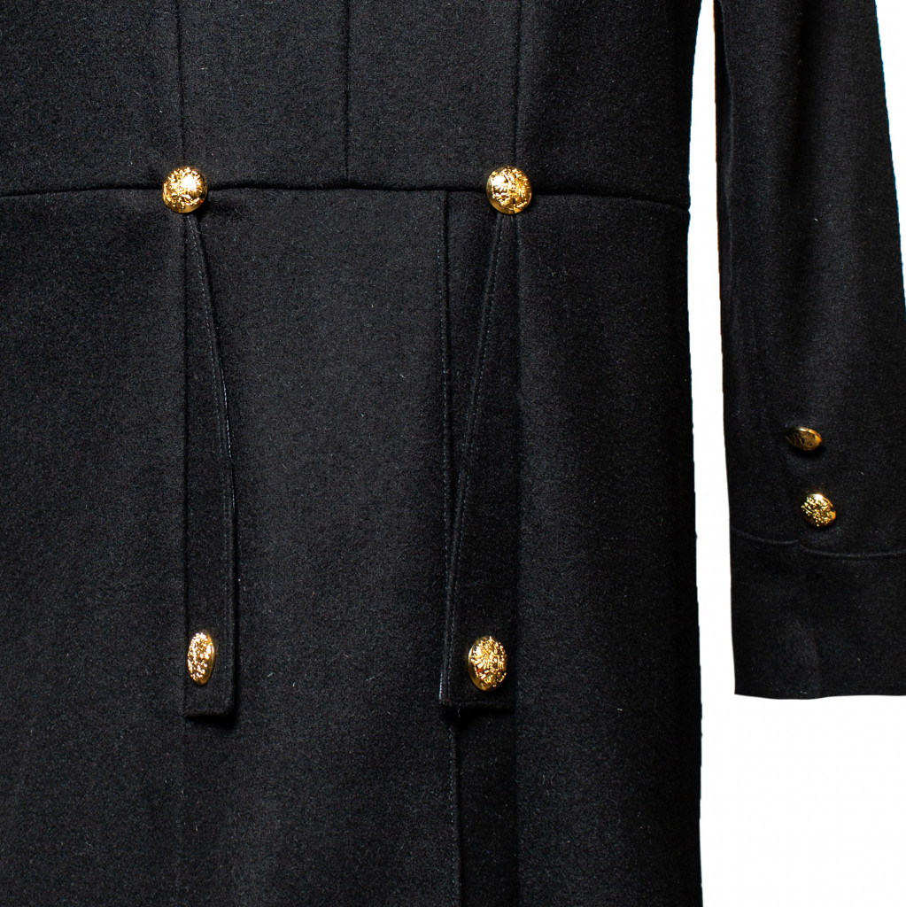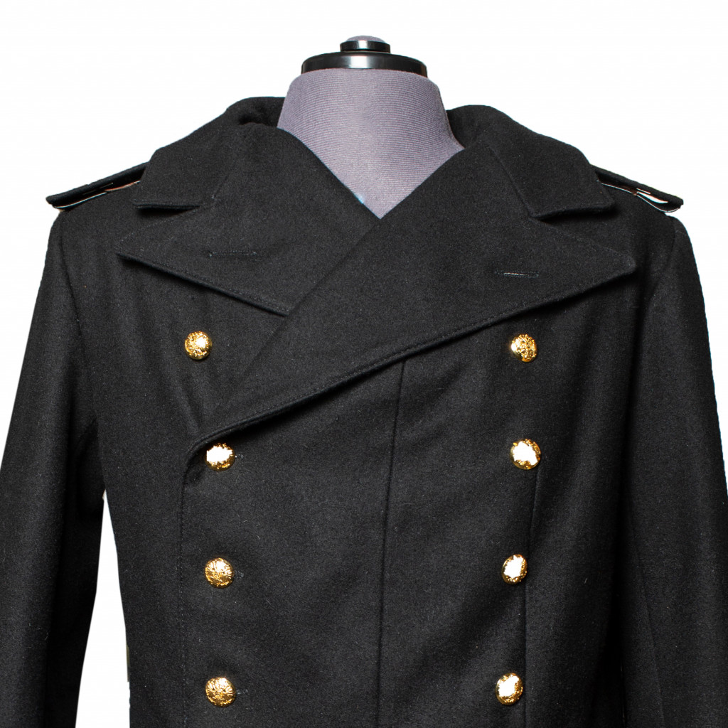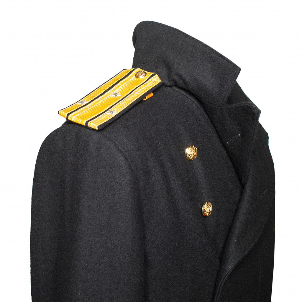 Современная копия сюртука Капитана 2-го ранга Флотского экипажа РИФ. Сюртук черного сукна, двубортный с двумя рядами (по шесть в ряду) пуговиц диаметром 22 мм желтого цвета приборного металла с изображением двуглавого императорского орла наложенного на скрещенные якоря (в 27 сентября 1904 году в ознаменование дня рождения цесаревича Алексея всем чинам флота было дано право носить пуговицы с изображением двуглавого орла) на бортах и сзади на карманных листочках юбки. Воротник отложной. Обшлага прямые. На рукавах сюртука у шва над обшлагами расположены по две пуговицы диаметром 16 мм желтого цвета приборного металла с изображением двуглавого императорского орла наложенного на скрещенные якоря. Подклад сюртука выполнен из шелковой ткани. На сюртук установлены погоны капитана 2-го ранга Флотского экипажа РИФ. Погоны изготовлены из нашитого золотого галуна на подбой черного сукна с установленными пуговицами желтого металла РИФ диаметром 16 мм, и шестью серебряными звездами по три на каждом.