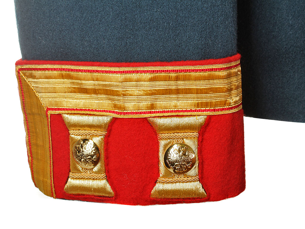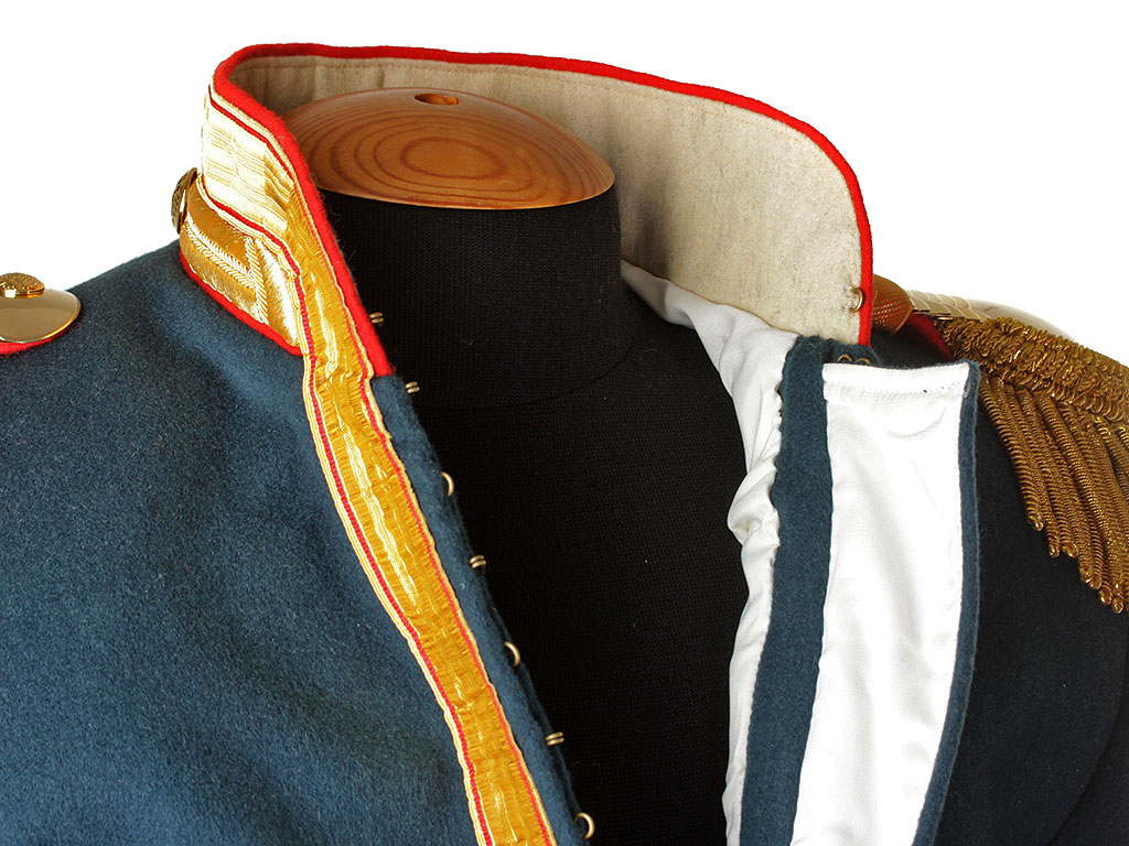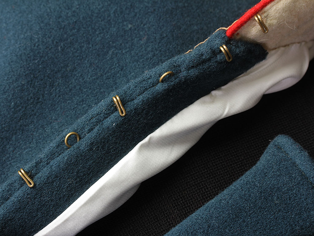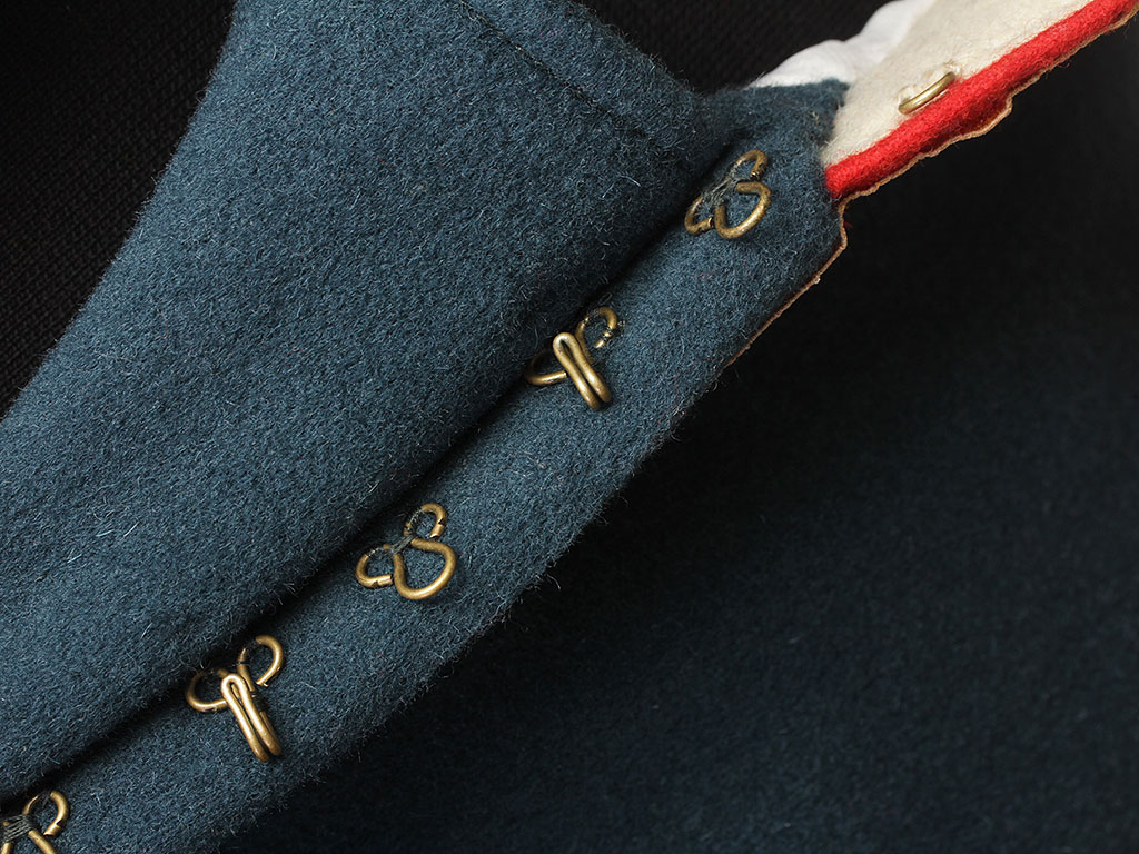 Мундир застегивается на ряд крючков, воротник стоячий.