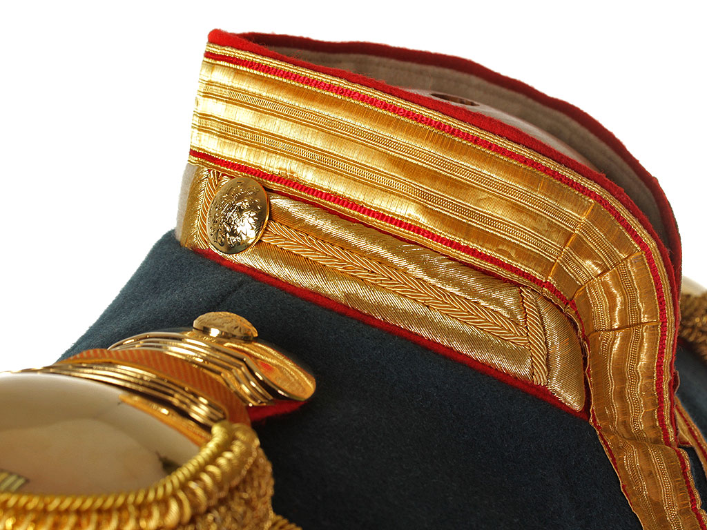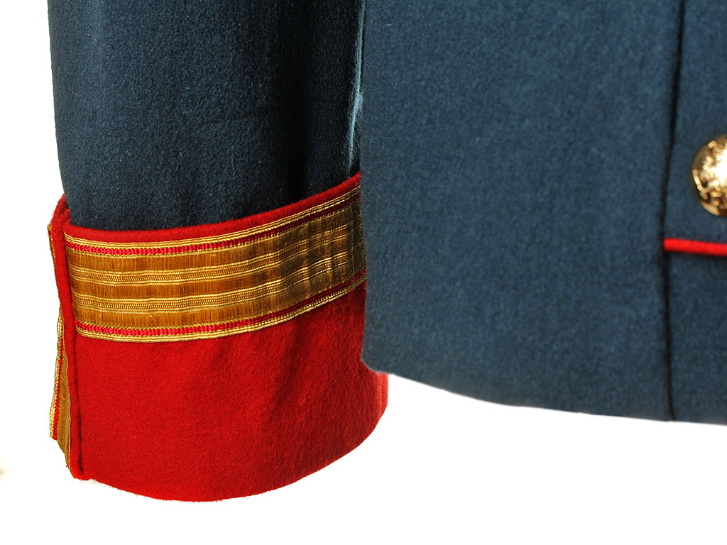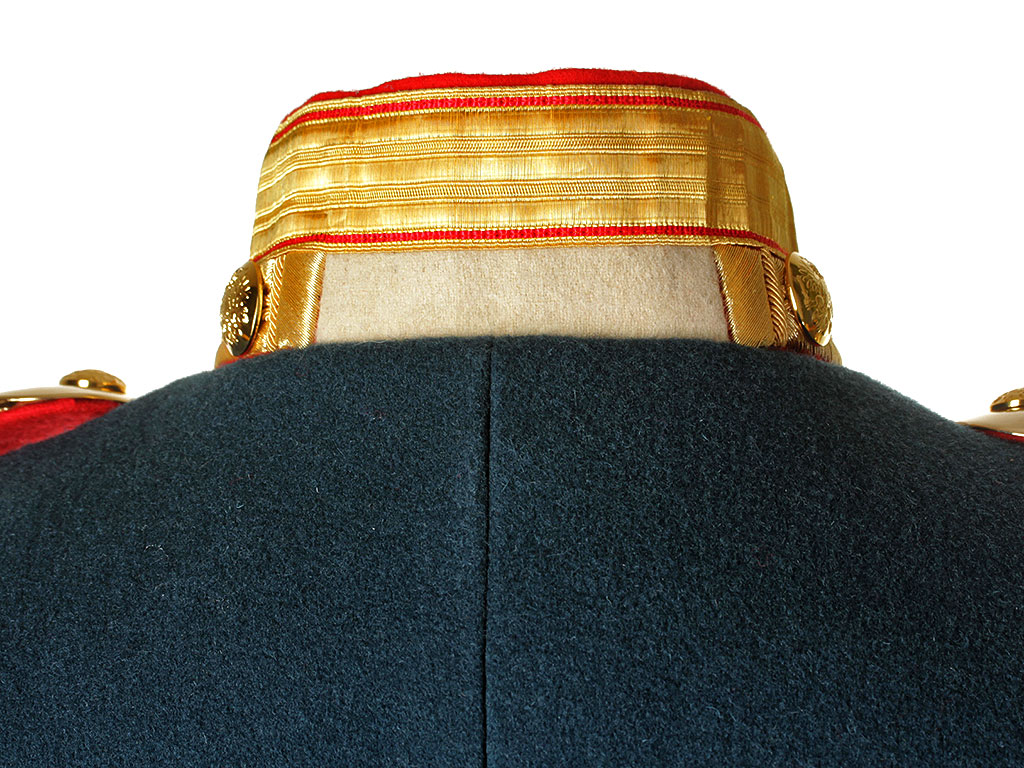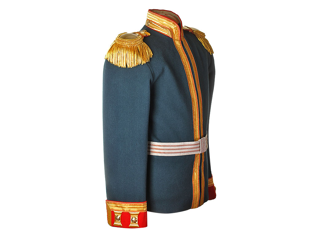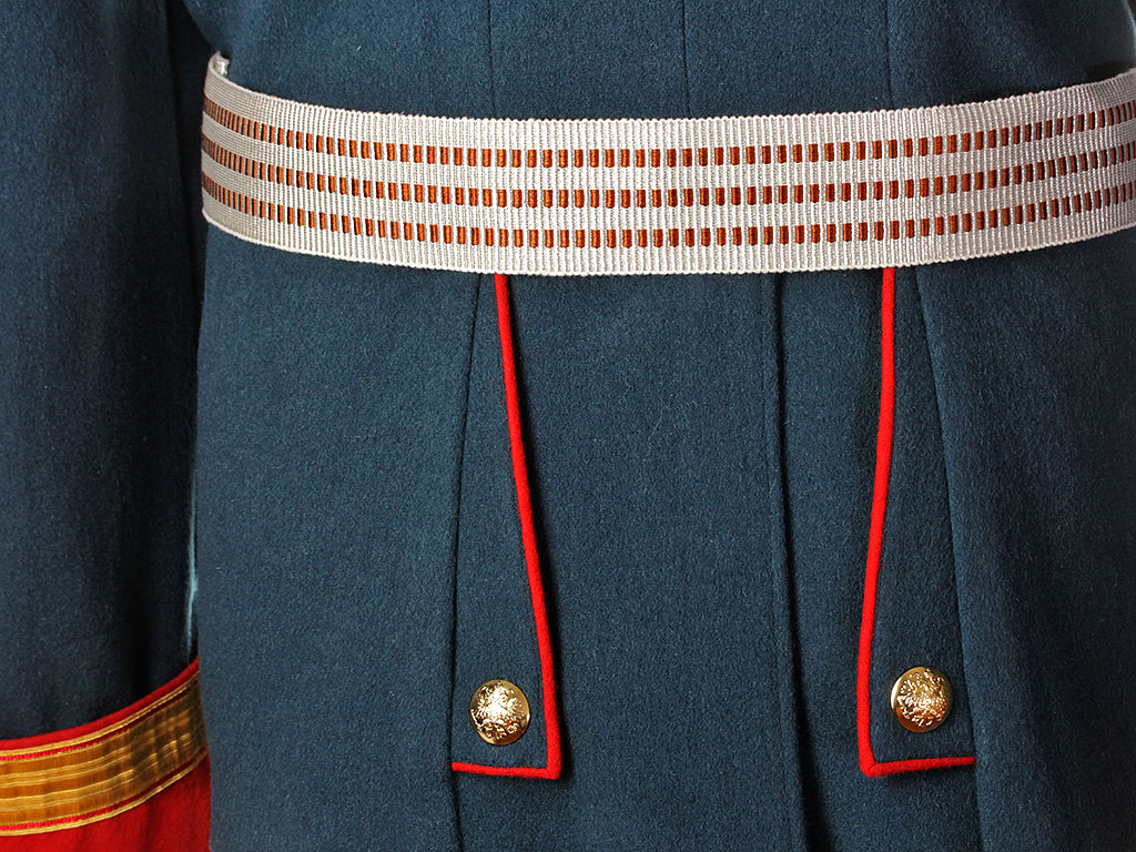 Мундир застегивается на ряд крючков, воротник стоячий.