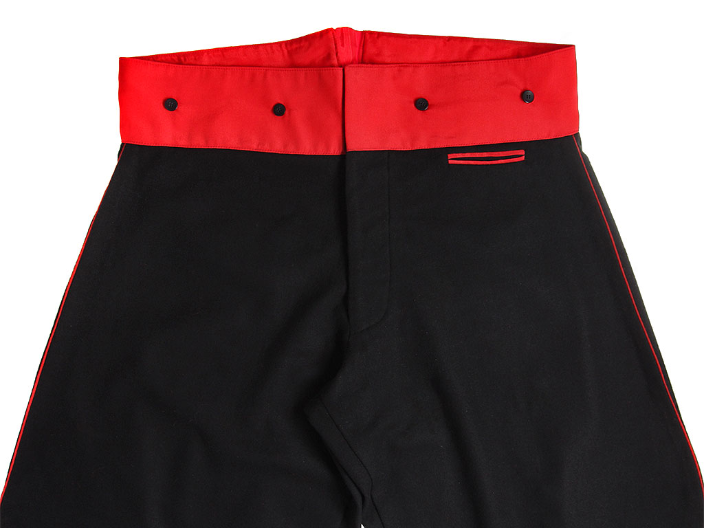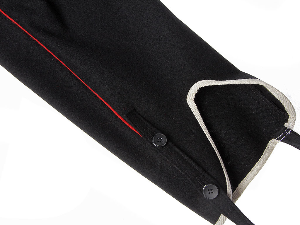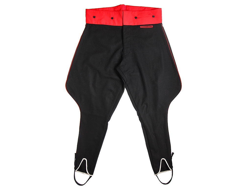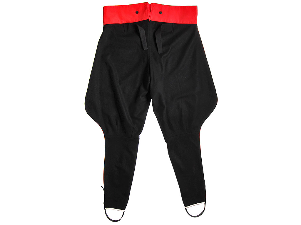 Изготовлены из черного плотного сукна с красными кантами, черными штрипками.