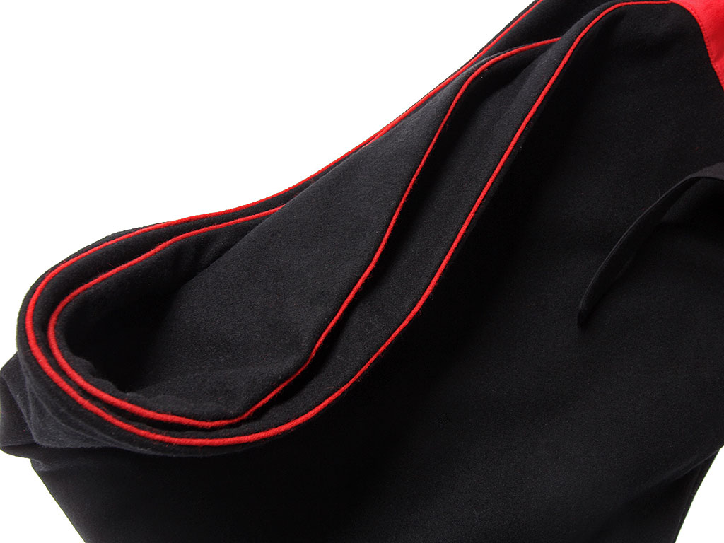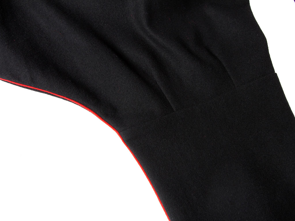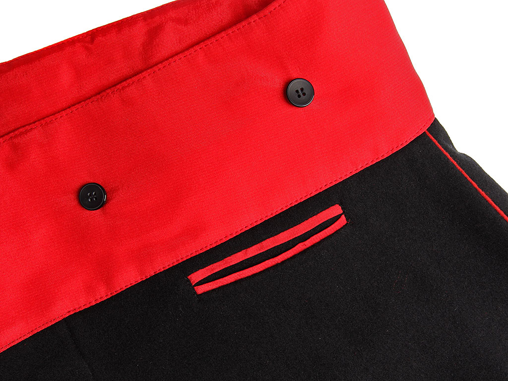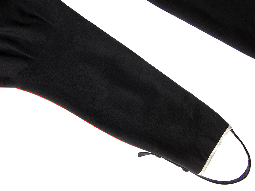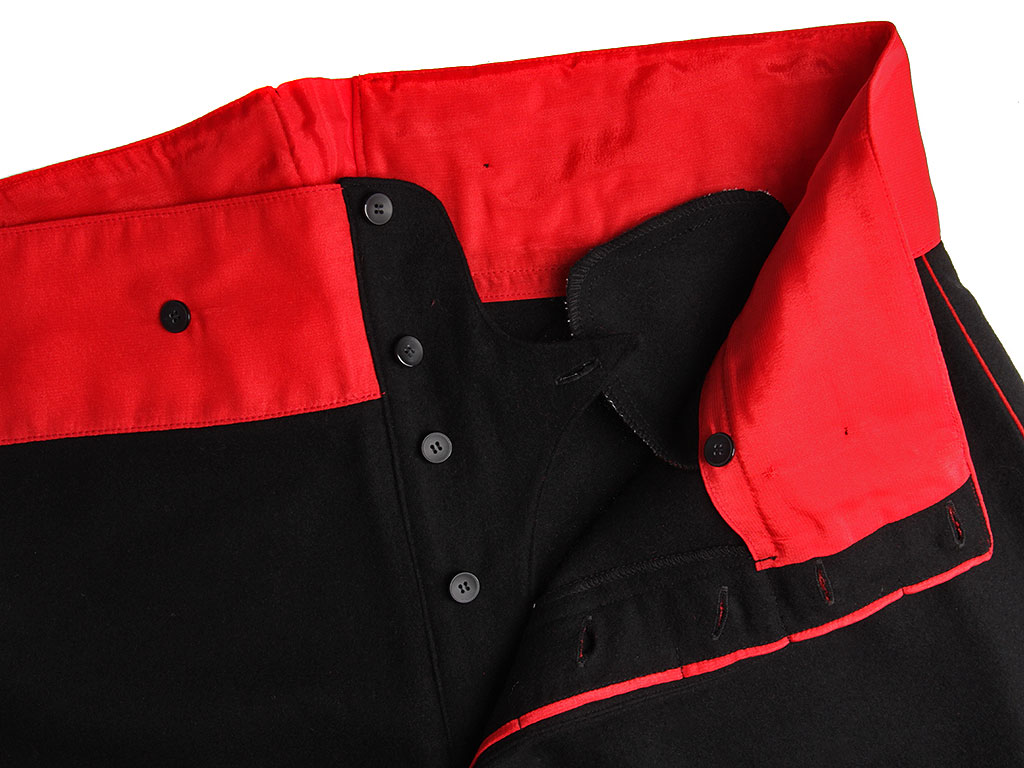 Изготовлены из черного плотного сукна с красными кантами, черными штрипками.