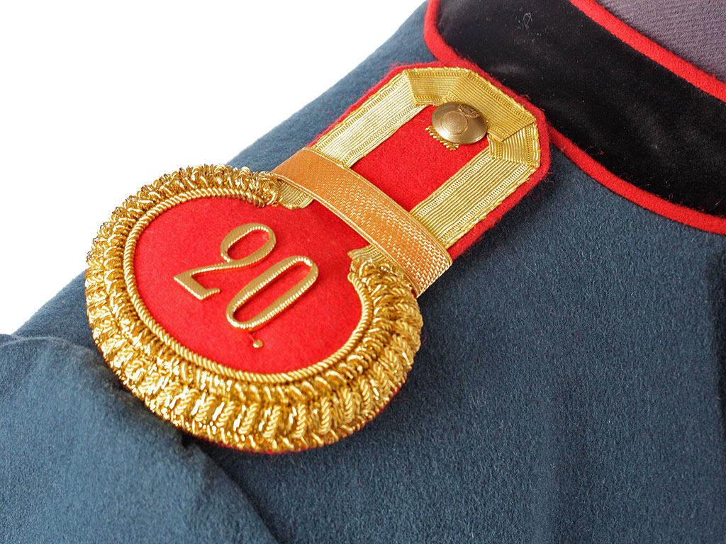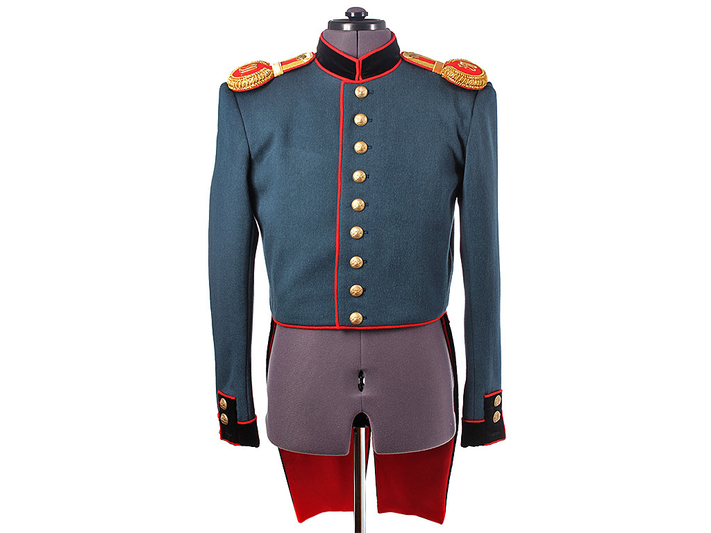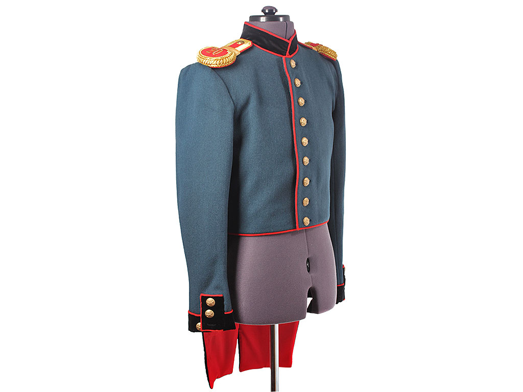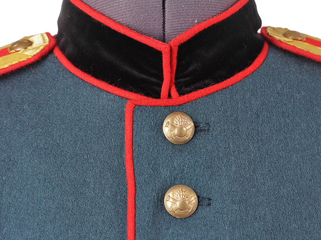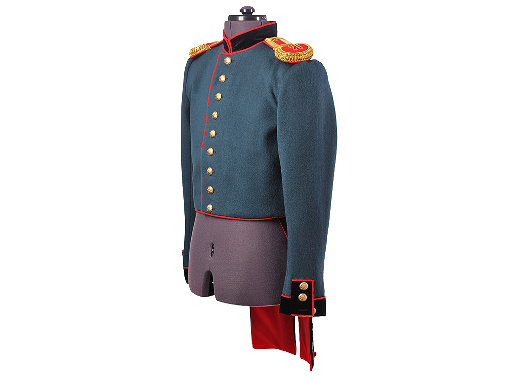 Мундир однобортный, темно-лазоревого цвета, с красным кантом по борту. Застегивается спереди на 9 пуговиц с изображением пылающей гренады на фоне скрещенных пушечных стволов ("гренада на пушках"). Воротник-стоечка из черного панбархата с красным кантом и подкладкой, застегивается на два латунных крючка. Установлены обер-офицерские эполеты с накладными золочеными цифрами "20" (20-я артиллерийская бригада). Обшлага рукавов черные с красной оторочкой и тремя пуговицами на каждом обшлаге (из которых одна "расстегнутая"). Мундир имеет длинные фалды с черной оторочкой и красным кантом, у основания которых расположены клапаны двух фальш-карманов. Подкладка белого цвета, фалды имеют алую подкладку, в которой расположены два потайных "перчаточных" кармана.