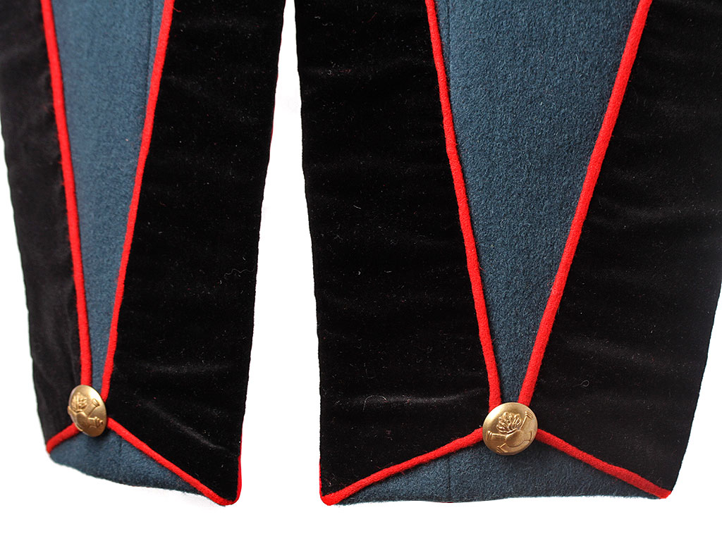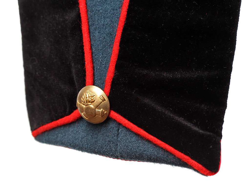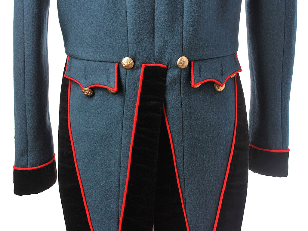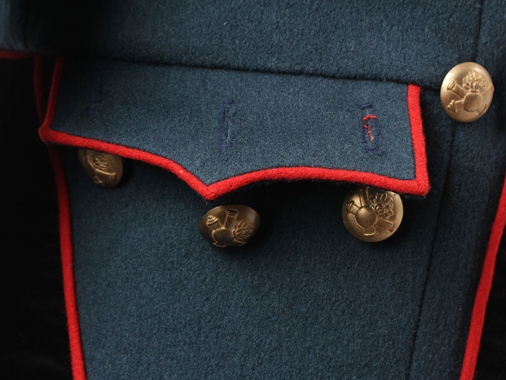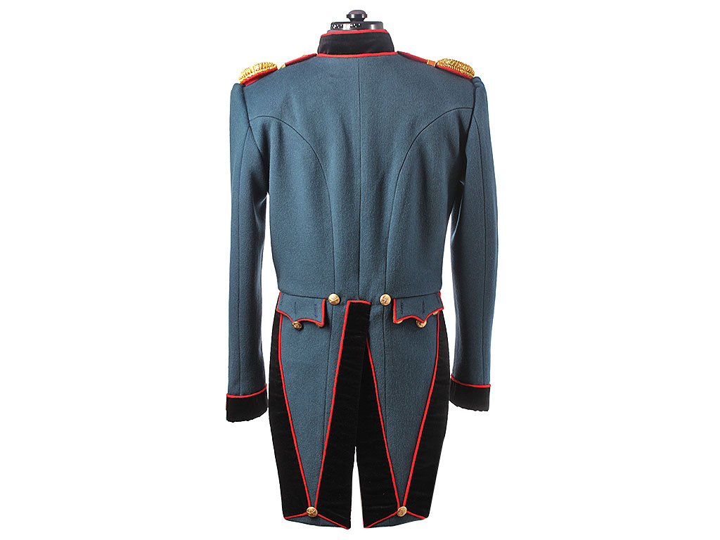 Мундир однобортный, темно-лазоревого цвета, с красным кантом по борту. Застегивается спереди на 9 пуговиц с изображением пылающей гренады на фоне скрещенных пушечных стволов ("гренада на пушках"). Воротник-стоечка из черного панбархата с красным кантом и подкладкой, застегивается на два латунных крючка. Установлены обер-офицерские эполеты с накладными золочеными цифрами "20" (20-я артиллерийская бригада). Обшлага рукавов черные с красной оторочкой и тремя пуговицами на каждом обшлаге (из которых одна "расстегнутая"). Мундир имеет длинные фалды с черной оторочкой и красным кантом, у основания которых расположены клапаны двух фальш-карманов. Подкладка белого цвета, фалды имеют алую подкладку, в которой расположены два потайных "перчаточных" кармана.