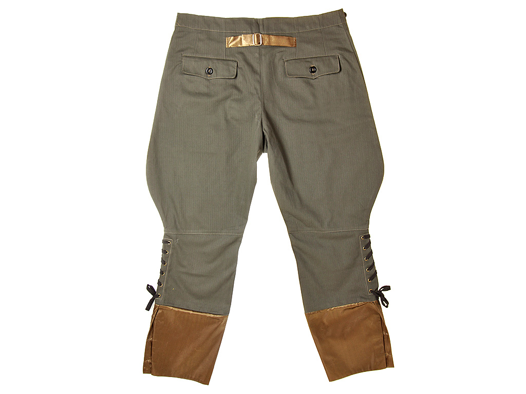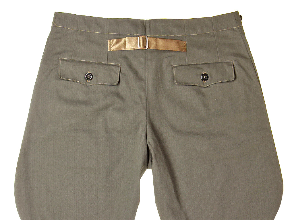 Брюки, обычно носившиеся рядовым составом и унтер-офицерами с форменным кителем, шились из серой ткани. Они были прямого покроя и имели относительно высокую талию. Брюки застегивались спереди на четыре пуговицы, пятая верхняя пуговица располагалась на поясе. Три пары пуговиц для подтяжек находились на поясе - две по сторонам и одна сзади. Позади поясная часть имела небольшой V-образный вырез с коротким матерчатым пояском с металлической пряжкой, который стягивал брюки в талии. Иногда для надежности рядом с пуговицами для подтяжек к поясу пришивались дополнительные пуговицы, роговые, пластмассовые или металлические.