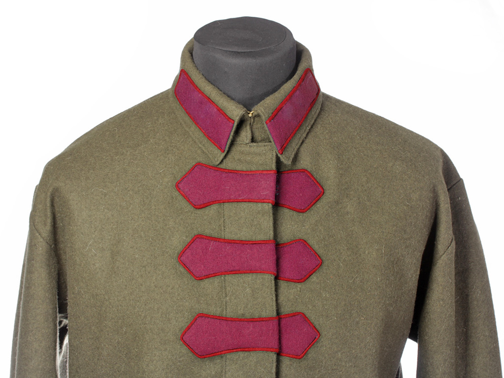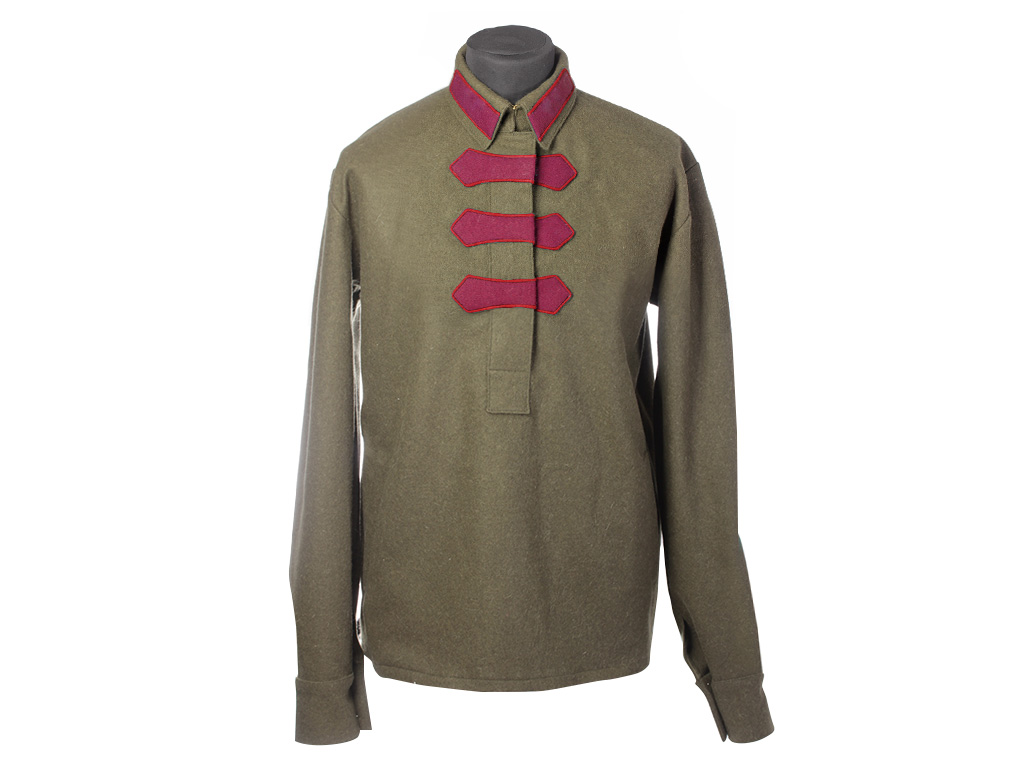 Гимнастерка со знаками различия пехоты РККА. Петлицы и "разговоры" имеют малиновое поле с красным кантом, они были введены в 1922 году.