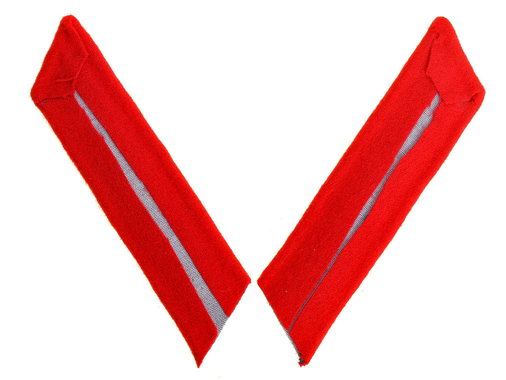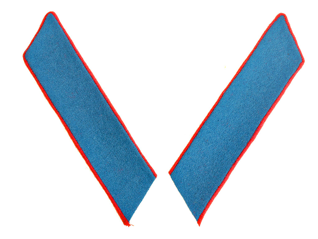 Петлицы устанавливались бирюзового цвета с кантом из сукна красного цвета. Гимнастерочные петлицы имели форму параллелограмма. Длина нашитой петлицы вместе с кантом — 9 см, ширина петлицы с кантом — 32,5-33 мм, ширина канта — 2,5 мм. Петлица нашивалась на воротнике гимнастерки или кителя. Шинельные петлицы имели вид ромба. Размер петлиц на шинель в нашитом виде: длина с угла на угол — 10-11 см, ширина с угла на угол — 8-9 см, длина окантованной стороны — 6,5 см, ширина канта — 2,5 мм.