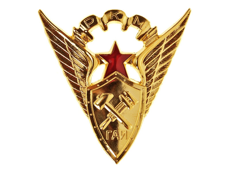 На рулевое колесо накладывалась мталлическая золоченая эмблема, состоящая из щита со скрещенными французским ключом и молотком и буквами " ГАИ ", увенчанного пятиконечной звездой красной эмали. От щита в стороны вверх расходились крылья, соединенные над звездой изогнутой дугообразно складчатой лентой, на складках которой помещались рельефные буквы " РКМ ". Нарукавный знак ГАИ/ОРУД заменил собой установленный знак начсостава милиции (герб СССР).