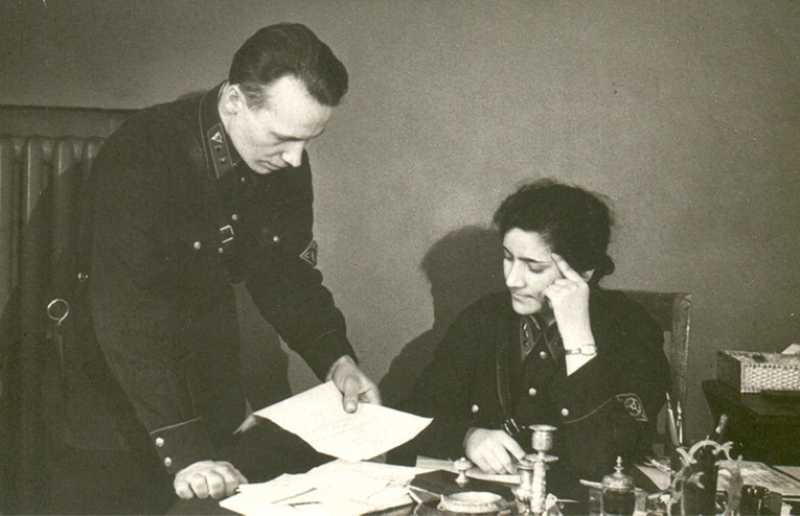 Обратите внимание на фото, слева стоит сотрудник ГАИ РКМ, с петличными эмблемами и нашивкой с накладной эмблемой, а за столом сидит сотрудница административной службы, которая не имеет петличных эмблем ГАИ. И нарукавная нашивка командного состава у неё также без накладной эмблемы