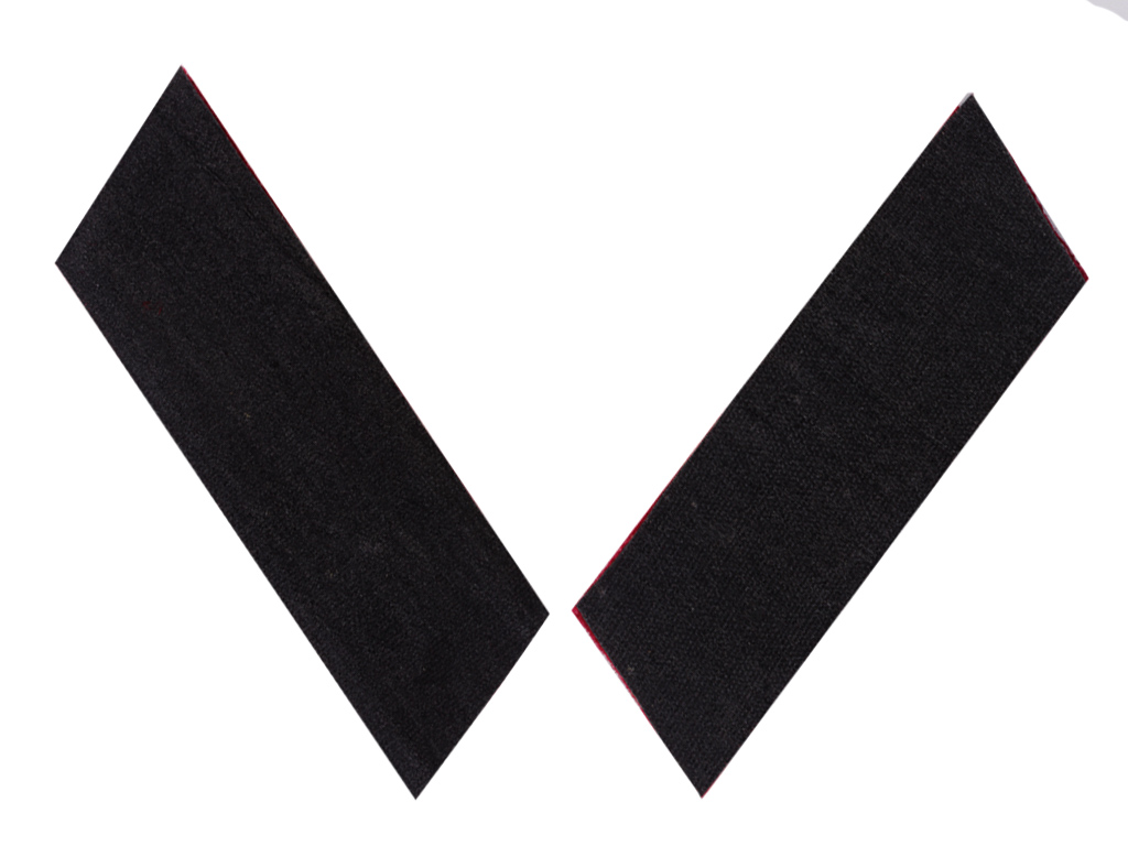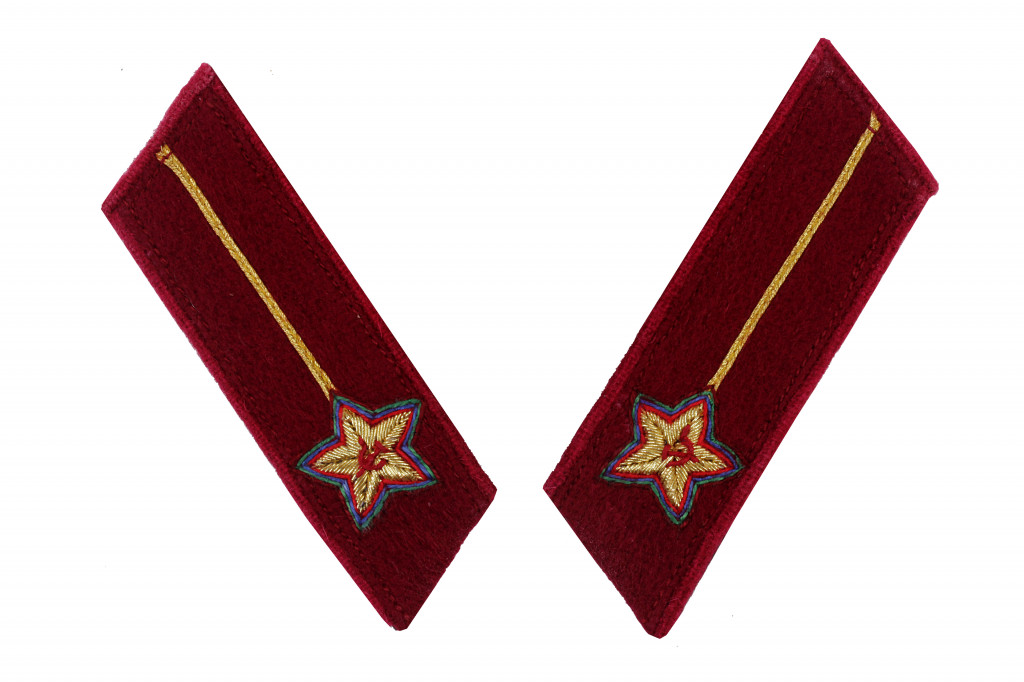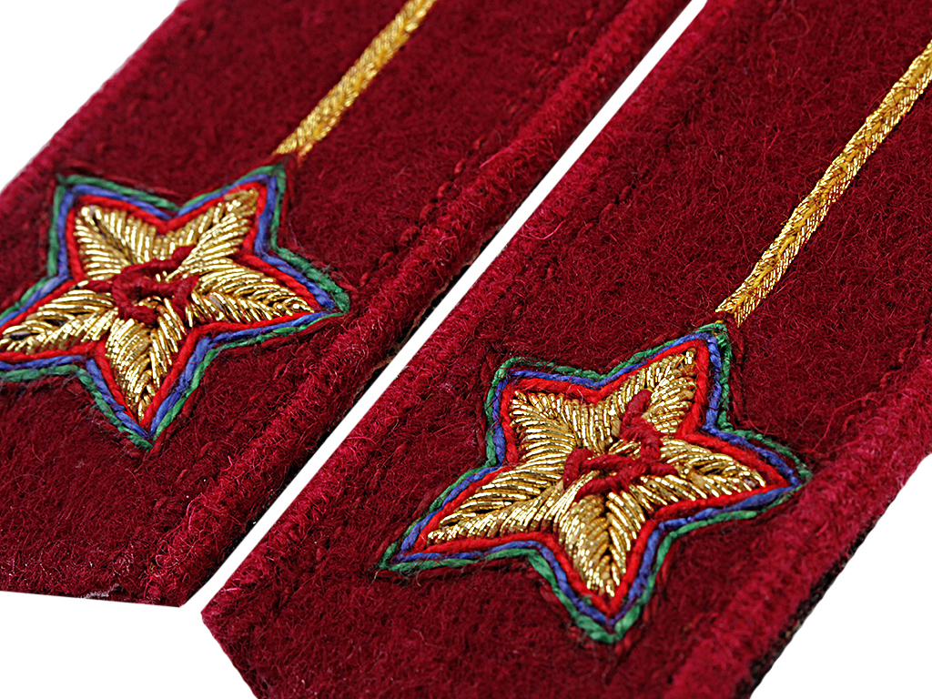 Генеральный комиссар ГБ получил на петлицы звезду, аналогичную нарукавной: из золотой мишуры, окаймленную красной, синей, зеленой и краповой шелковыми нитями, с серпом и молотом в центре. Звезда занимала всю ширину поля петлицы и располагалась у нижнего (неокантованного) ее конца. При этом золотая полоска, идущая от середины короткой окантованной стороны петлицы, ограничивалась концом верхнего луча звезды.