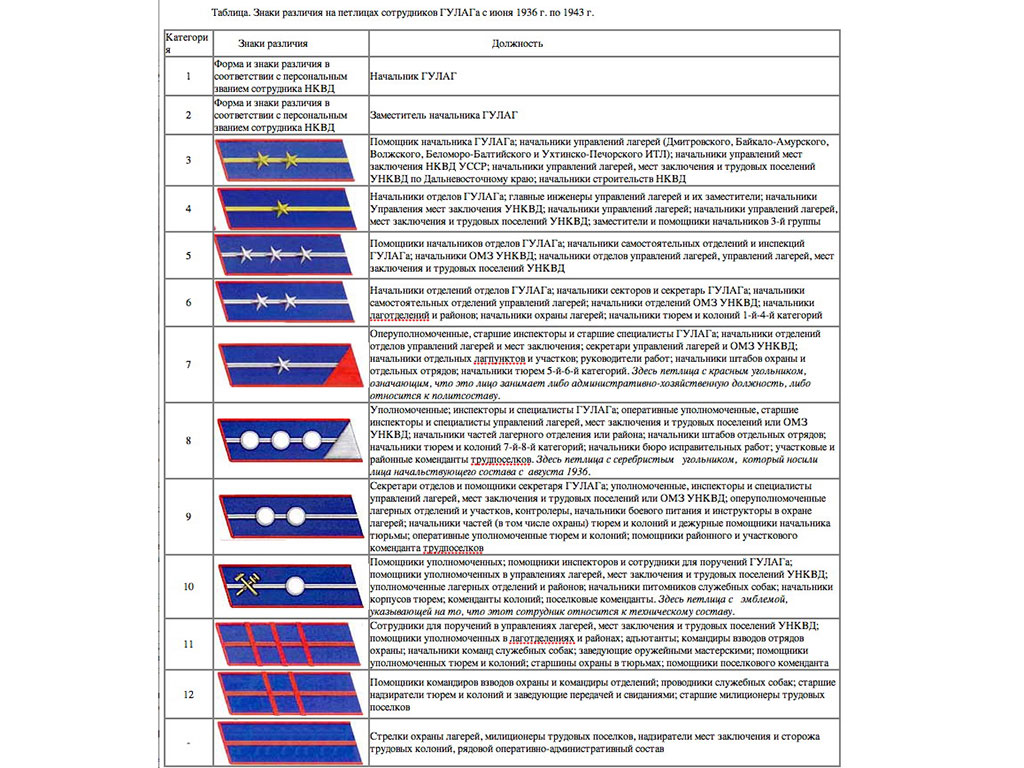 Еще раз подчеркиваю, что персональных званий в системе ГУЛАГ введено не было и знаки различия существовали по должностным категориям.