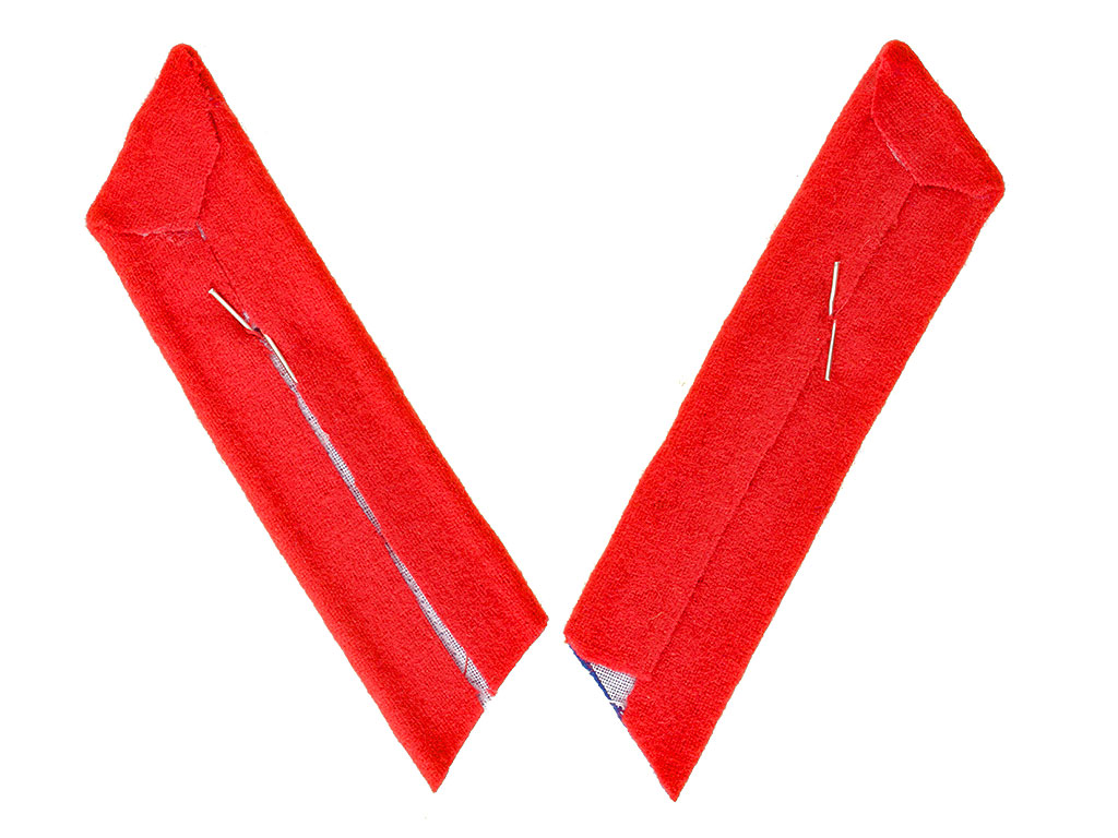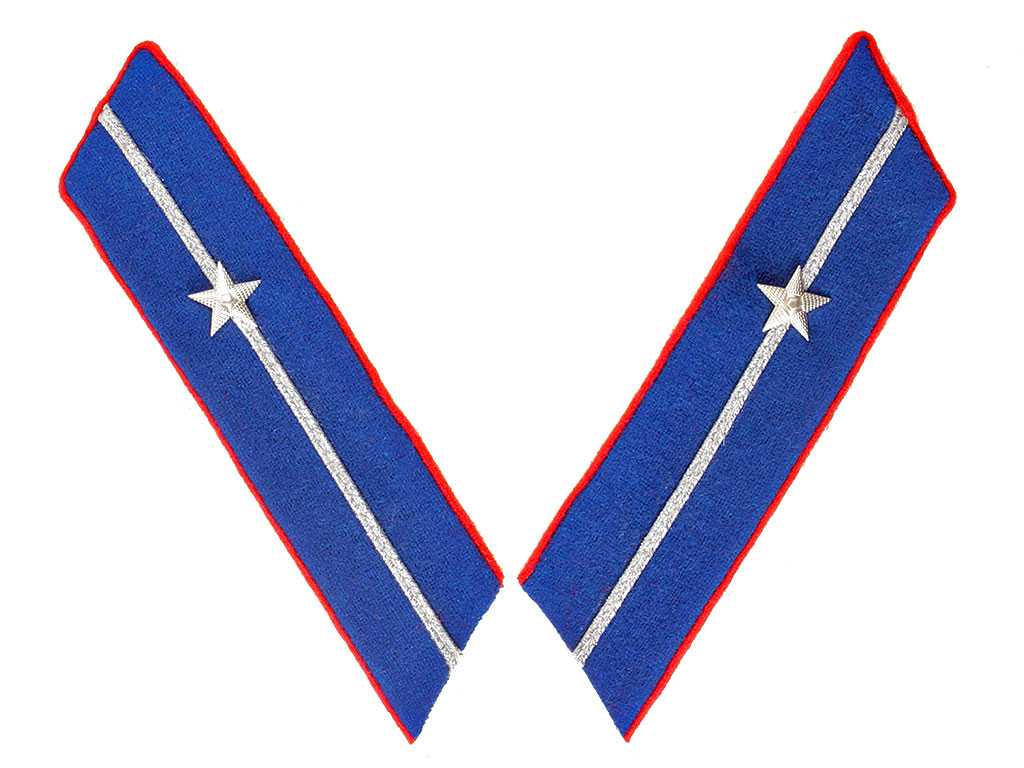 Петлицы василькового цвета в форме параллелограмма длиной 9-10 см и шириной 3,3 см окантовывались с двух продольных и одной поперечной сторон красной выпушкой, шириной 0,25 см; посередине петлицы нашивался продольный сутажный шнур шириной 0,3 см: