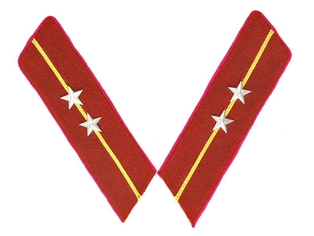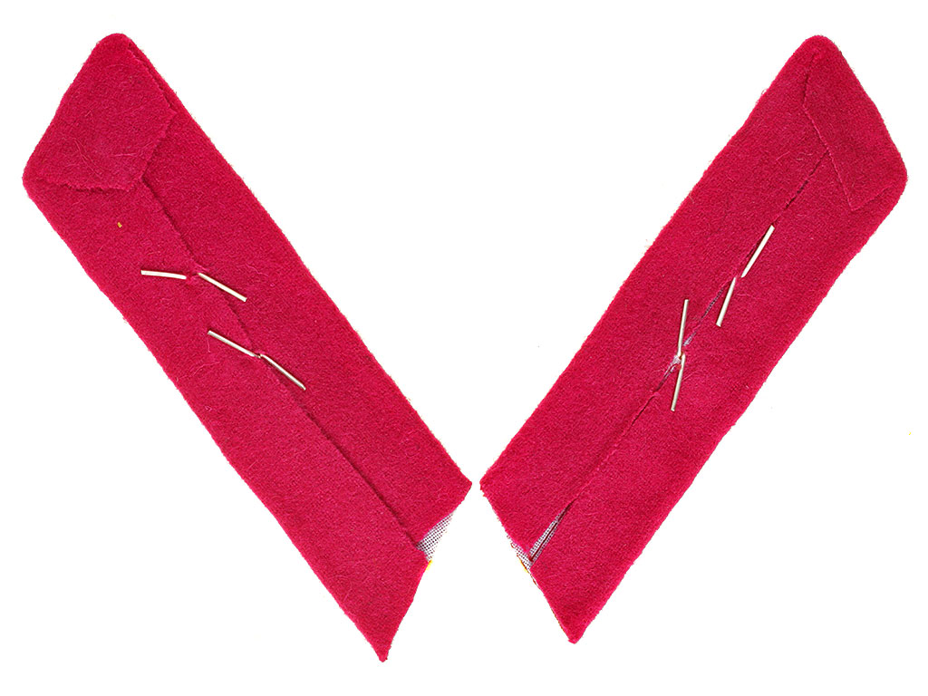 б) Петлицы пошиваются из приборного сукна крапового цвета с малиновым кантом и продольной полосками (посредине) желтого цвета, шириной в 2,5 мм, которые нашиваются одна от другой на расстоянии 7 мм.