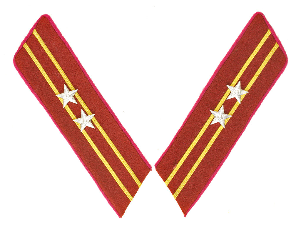 б) Петлицы пошиваются из приборного сукна крапового цвета с малиновым кантом и продольной полосками (посредине) желтого цвета, шириной в 2,5 мм, которые нашиваются одна от другой на расстоянии 7 мм.