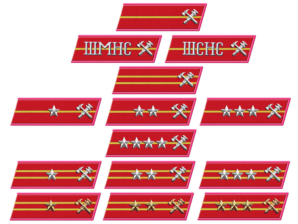 д) Весь личный состав на петлицах носят значок, состоящий из скрещенных топорика с французским ключом. Для высшего начальствующего состава цвета золота, для всех остальных – цвета серебра.