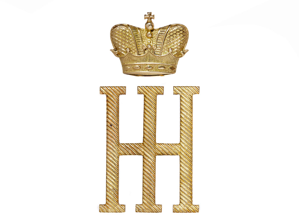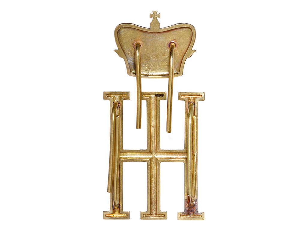 Вензель великого князя Николая Николаевича с короной, большой латунный, для нижних чинов. Данный вензель имел характер шифровки, то есть не относился к группе вензелей Высочайших Шефов и полагался для ношения всеми нижними чинами полка. У офицеров использовался позолоченный вензель.