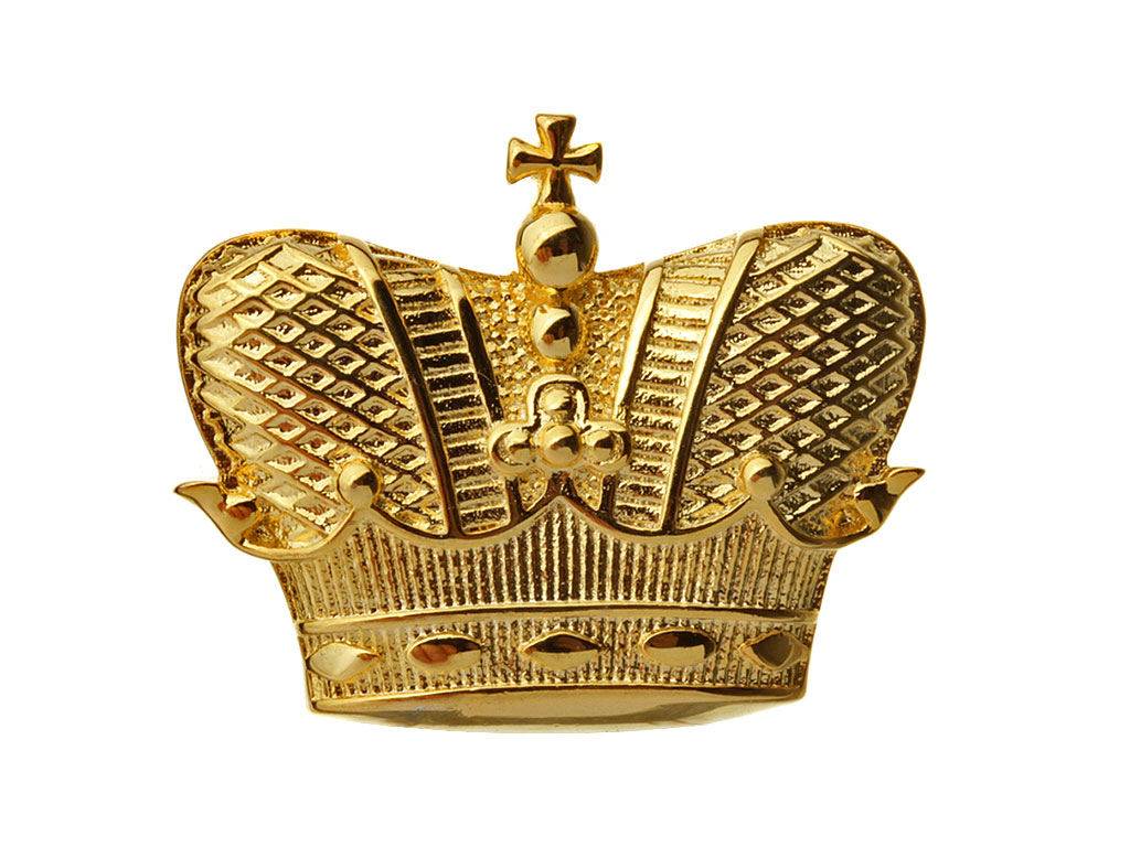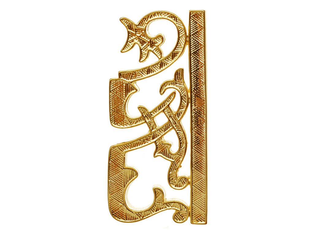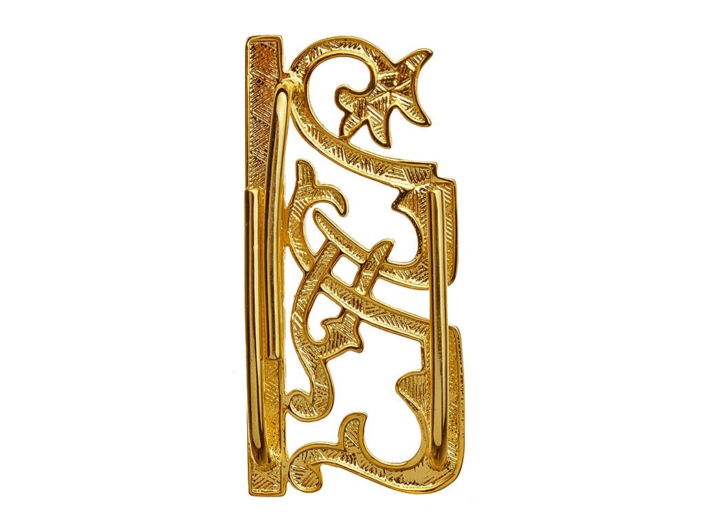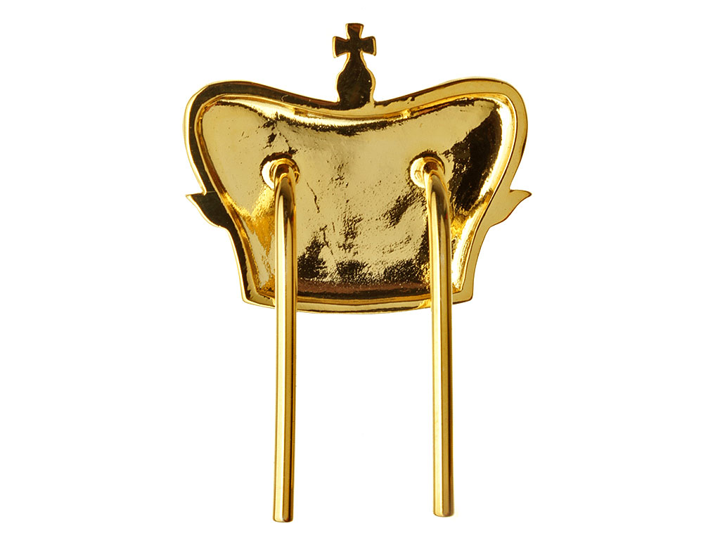 Изготовлен штампом из латуни, позолочен. Качественная проработка мелких деталей, четкий рельеф. С обратной стороны имеет крепление в виде кляммеров (усов).
