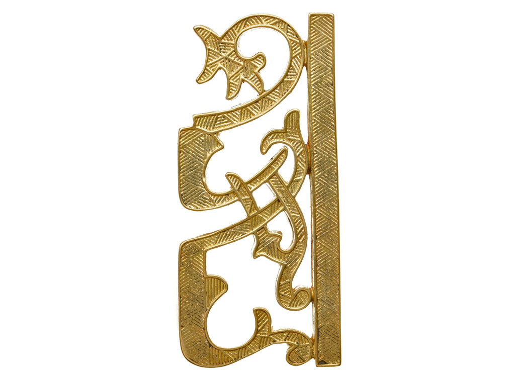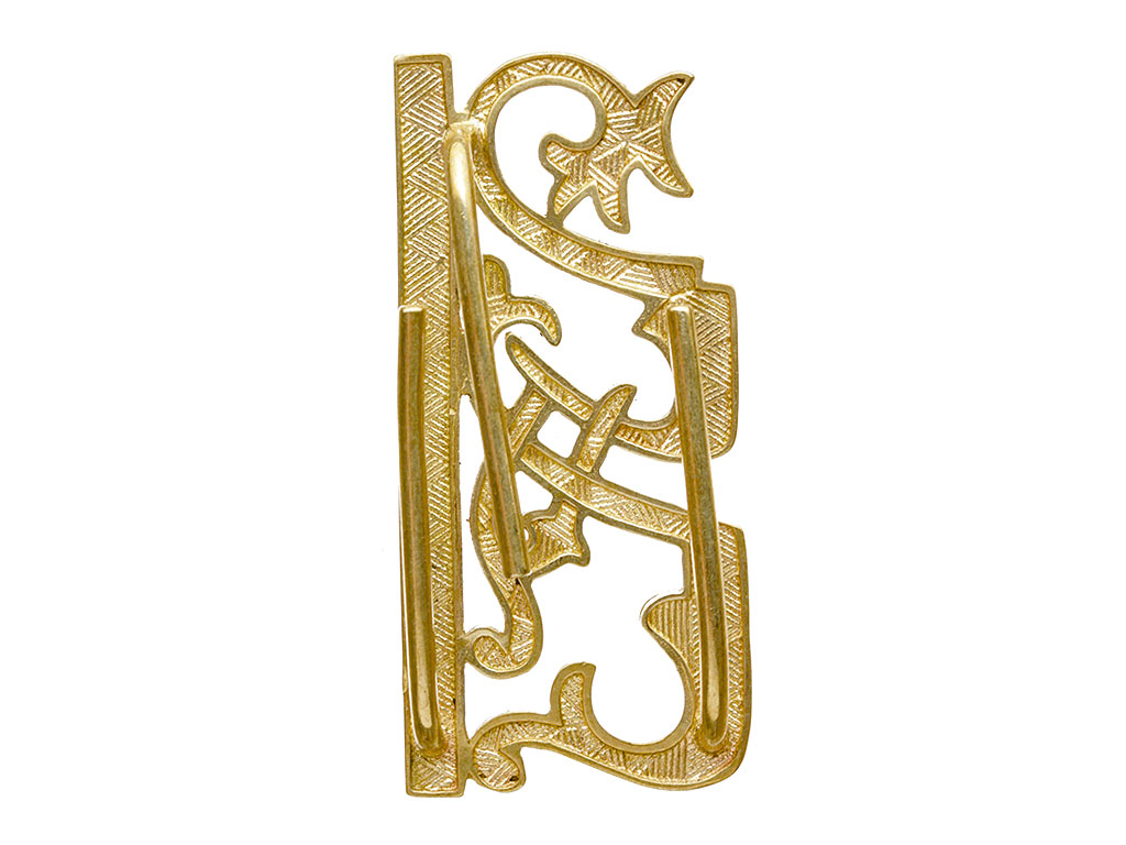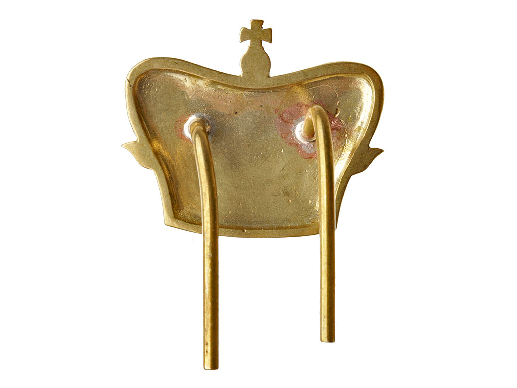 Изготовлен штампом из латуни. Качественная проработка мелких деталей, четкий рельеф. С обратной стороны имеет крепление в виде кляммеров (усов).