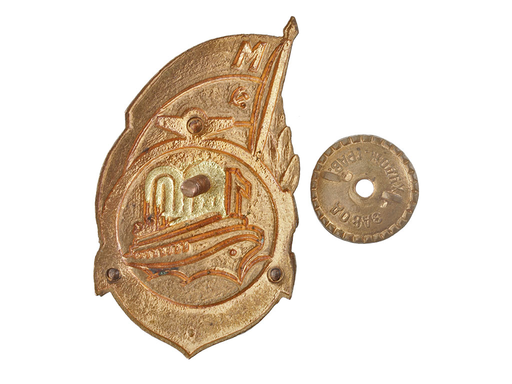 Нагрудный знак "100 лет Московскому пароходству". Завод художественной гравюры, 1958 год. Латунь, эмаль, золочение.