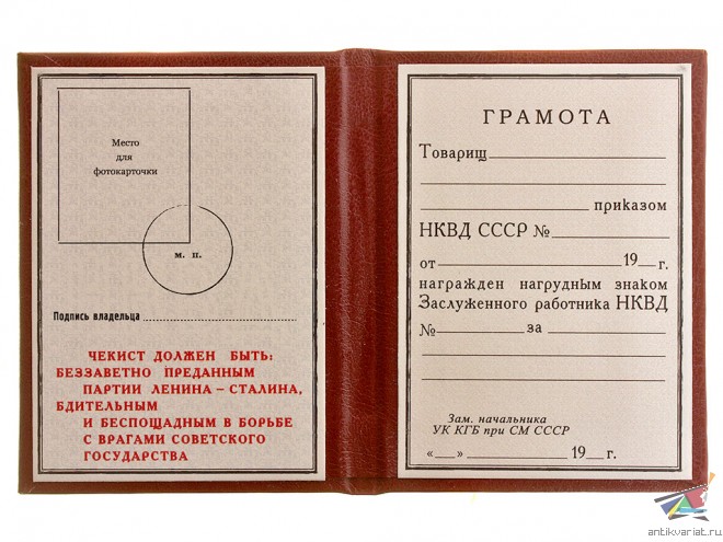 3. Награжденные знаком «Заслуженный работник НКВД» служат примером образцового выполнения своих обязаностей. Они должны быть беззаветно преданными партии Ленина-Сталина, бдительными и беспощадными в борьбе с врагами советского государства.