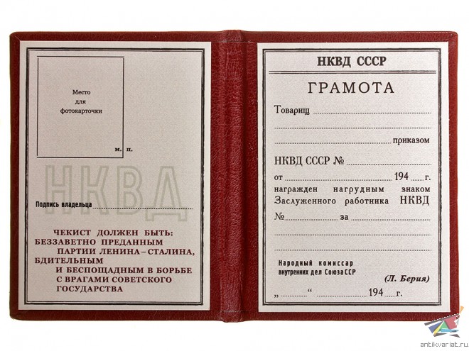 Лот, состоящий из Грамоты к нагрудному знаку "Заслуженный работник НКВД" за подписью Народного Комиссара Внутренних Дел СССР и непосредственно знака "Заслуженный работник НКВД" образца 1940 года (ранний вариант Грамоты).